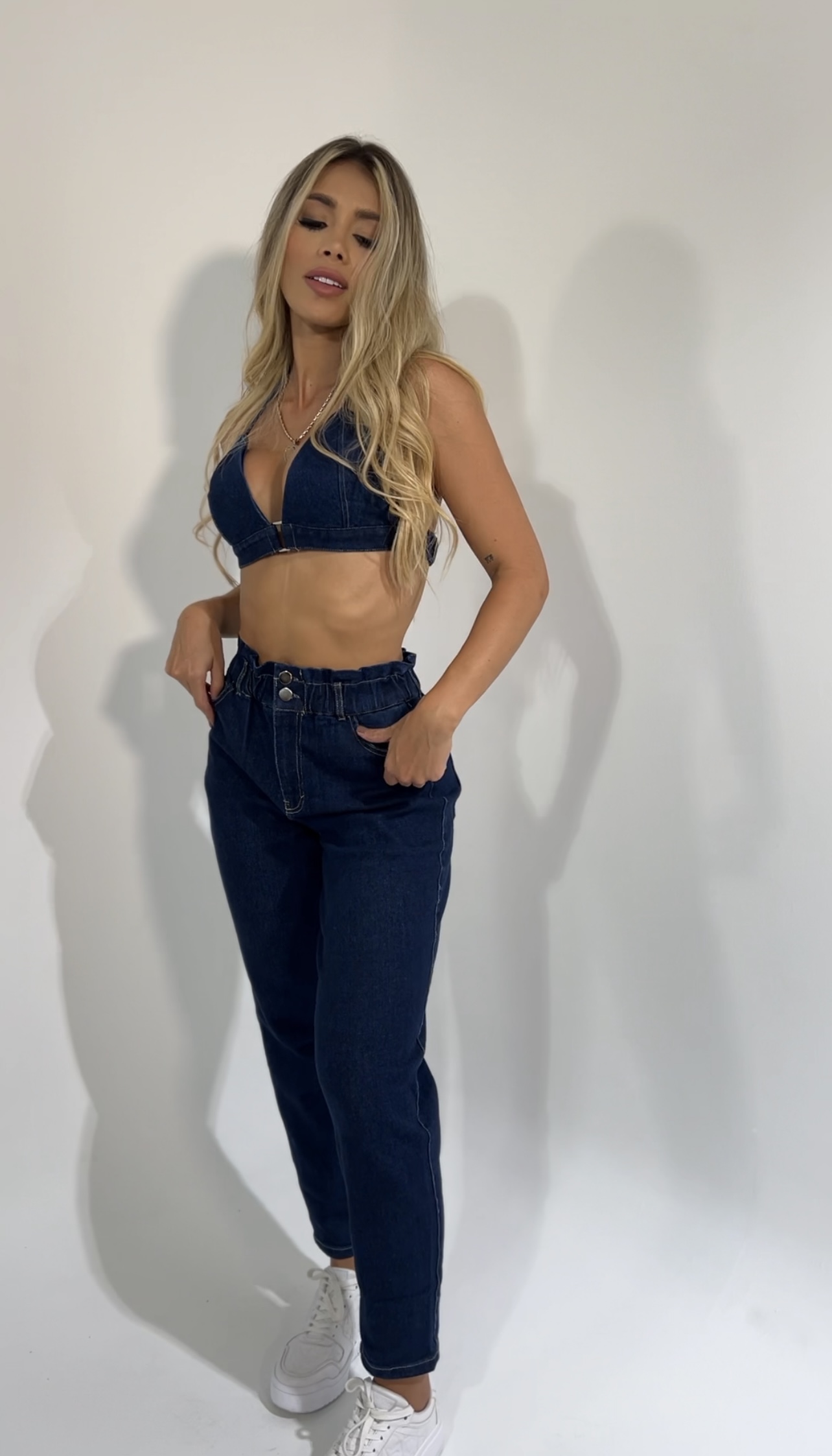 Set denim pantalón con resorte crop top de atar